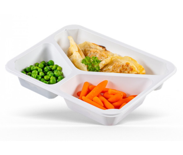 Компактний пластиковий лоток білого кольору на три секції, призначений для пакування готових страв.
