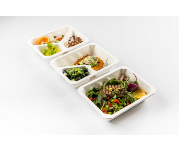 Поділ контейнера на три секції дозволяє пакувати три різних продукта, що дуже зручно для упаковки готових обідів.